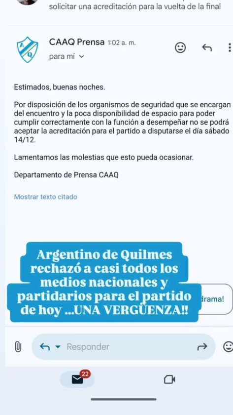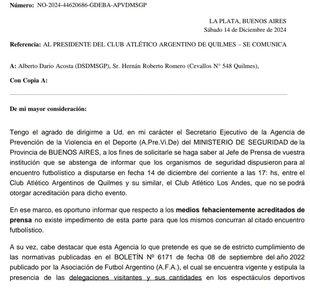 Hoy a las 17 se llevará a cabo el encuentro de vuelta entre Argentinos de Quilmes (CAAQ) y el Club Atlético Los Andes en la barranca. Anoche, después de las 01 comenzaron a llegar mensajes de censura del Club AAQ a varios periodistas partidarios de Los Andes y nacionales. «Por disposición de organismos de seguridad y ante la poca disponibilidad no podrán ser acreditados», dice el comunicado de prensa CAAQ, aunque APREVIDE desmintió ésa info con otro comunicado que adjuntamos.