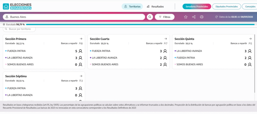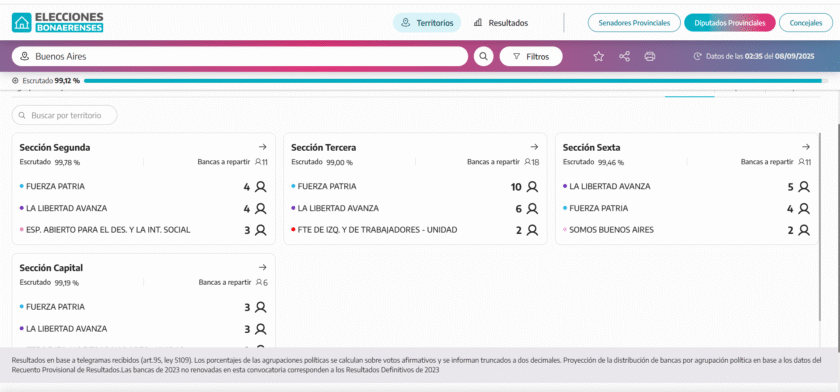 La participación fue del 62% del padrón habilitado. Según el recuento provisorio, el Frente de Izquierda y de los Trabajadores, llegó al 4,9%, Nuevos Aires, 3,1%, y Somos Buenos Aires, 1,8%, aunque ninguna de estas tres fuerzas alcanzó el piso electoral necesario para disputar bancas.