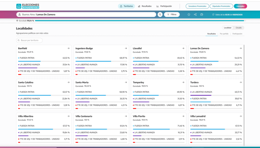 La elección en Lomas de Zamora dejó un resultado favorable para Fuerza Patria, alineada con el gobernador Axel Kicillof y conducida en el distrito por el intendente Federico Otermín, que alcanzó el 55,8% de los votos. En segundo lugar La Libertad Avanza, con un 28,1%.